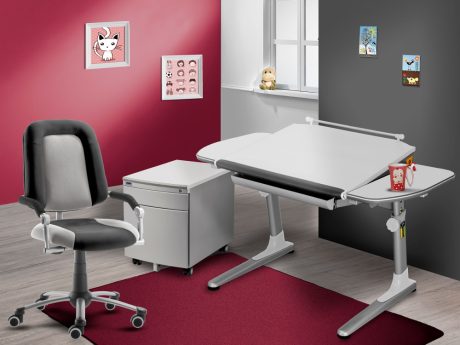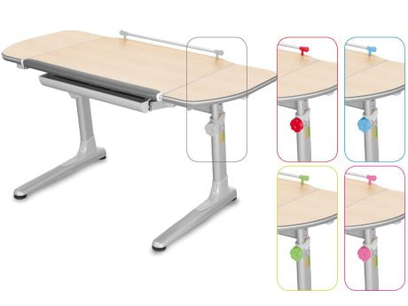 Stolová deska s možností nastavení úhlu střední části plochy. Boční části jsou pevné a slouží k odkládaní věcí. Deska stolu je rozměru 116 x 66 cm. Stůl je opatřen měkkou 3D ABS hranou v šedé barvě s bílou linkou, která je příjemná na zápěstí dětí a také zamezuje úrazům. Profi3 má v základním vybavení zásuvkový organizátor. Ovládaní výšky stolu ( 57-75 cm) je pomocí aretačních šroubů.