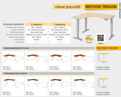 Výškově stavitelné stoly jsou rozděleny do 2 základních skupin podle typu podnoží. 2-segmentové s rozsahem výšek pracovní desky 70,5 – 120,5 cm a 3-segmentové s větším výškovým rozsahem 64 – 130,5 cm. Volit lze z velkého množství barevných kombinací (3 barvy podnoží, 9 barev pracovní desky) a ze 2 typů ovladačů. Do paměťového ovladače lze uložit až 4 různá nastavení pracovní výšky.